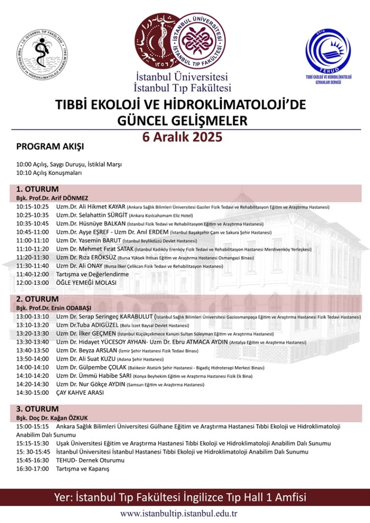 İstanbul Üniversitesi İstanbul Tıp Fakültesi Tıbbi Ekoloji ve Hidroklimatoloji Anabilim Dalı Kuruluşunun 87. Yılında Tıbbi Ekoloji ve Hidroklimatoloji Uzmanlar Derneği (TEHUD) ile birlikte anlamlı bir buluşmaya ev sahipliği yapıyor. Eğitim, Araştırma ve Hizmet algısındaki dönüştürücü güncel gelişmeler tartışılıyor. Kuruluş yıldönümüne özel olarak düzenlenen bu etkinlikte sizleri de aramızda görmekten onur duyarız.